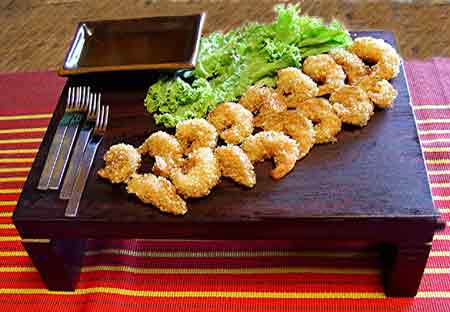 | | Langostinos:  | 50 colas de langostinos, limpias (dejando la colita) |  | 300 g de quinua o 1 paquete de panko, de 160 g aprox. (sección oriental de supermercados) |  | 200 g ( 7 oz) de chuño (almidón de papa). Se puede reemplazar por harina |  | 3 – 4 claras de huevo, ligeramente batidas |  | Aceite, la cantidad necesaria |  | Sal | Miel de Naranja:  | 1 taza de jugo de naranja fresca |  | ½ taza de jugo de toronja fresca |  | Jugo de 1 limón |  | ¼ de taza de caldo de pollo |  | 3 dientes de ajo, triturados |  | 3 cucharadas de miel de maíz |  | 3 cucharadas de azúcar |  | Gotas de Tabasco |  | Sal |  | Pimienta | | |